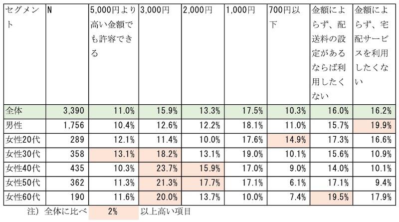 図2で、男女20~60代全体では「3,000円」までがボリュームゾーンである。女性においては、仕事や子育てに忙しい30代で許容額が高い。40~50代だと一段厳しくなるのはリアル店舗の利便性に慣れていることも一因だろう。60代では配送料の設定があることへの抵抗も少なくなく、ややこしい仕組みは避けるべきだ。