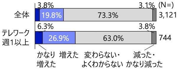 NRIの実施した調査でも、23.6%の人が家庭での冷食の利用が増えたと回答した(図1)。週に1回以上テレワーク(またはオンライン授業)のある層では、この割合が33.2%にもなる。しかし、増えているのは昼食時の利用だけではない。