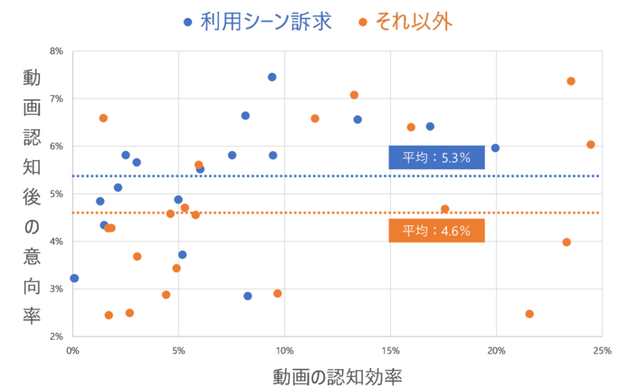 実際に、広告への接触状況を想定しながら利用シーンの訴求を行った広告クリエイティブとそれ以外のクリエイティブを比較すると動画広告認知者への購入意向を喚起する効果は利用シーン訴求を行った動画広告が平均+5.3ptであり、それ以外のクリエイティブよりも高い結果が得られた。