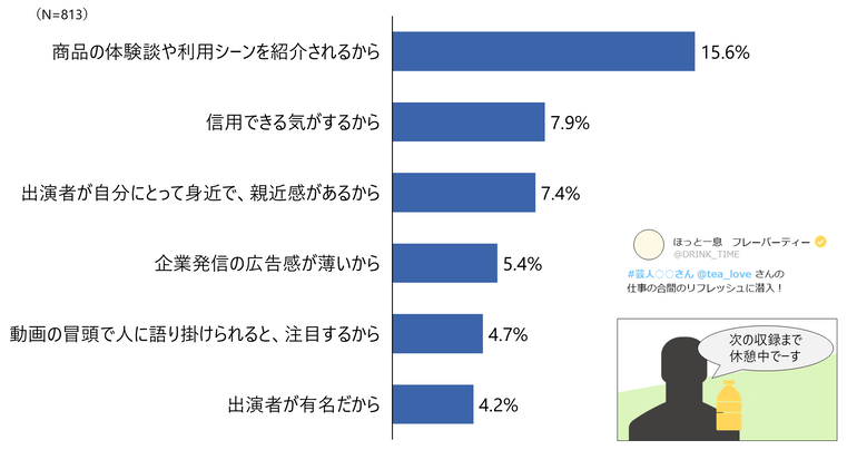 一例として、「仕事の合間に飲む」という利用シーンを訴求していた飲料の動画広告の視聴後に購入意向が高まった人の要因を調査したところ「利用の体験談や利用シーンを紹介されるから」という回答が最も多いことが分かった。具体的な利用シーンを訴求することで、商品を自分ごと化しやすくなり、購入意向に作用したものと考えられる。