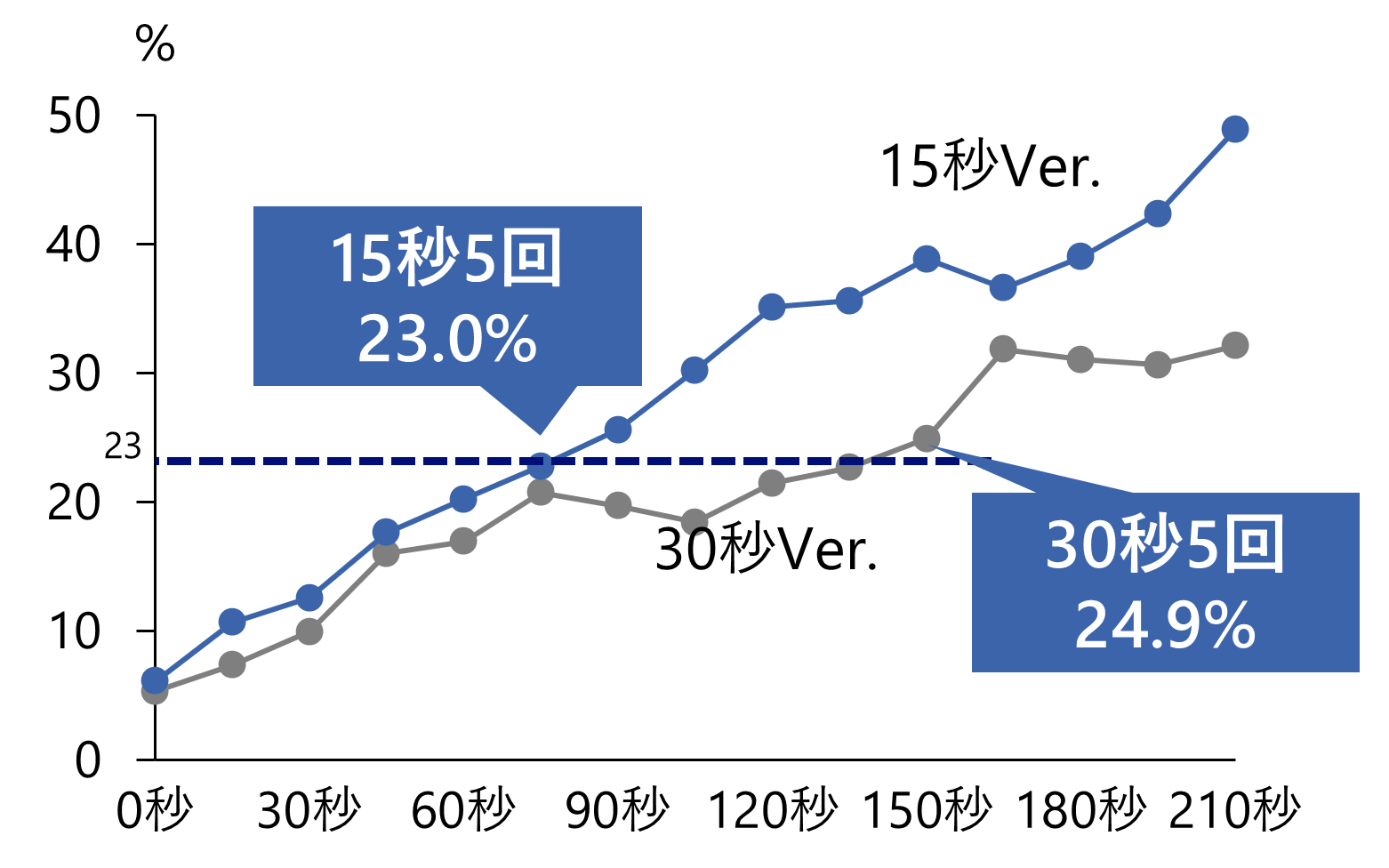 そこで、広告の費用対効果を分析するために、類似素材の15秒CMと30秒CMについて同じ接触回数での広告認知率の比較を行った。30秒CMは2倍の放映時間があるので当然広告認知率も30秒CMのほうが高いことが期待されるが、実際には15秒CMに5回接触した時の広告認知率は23.0%であったのに対して、30秒CMに5回接触したときの広告認知率は24.9%であり、両者でほとんど差がついていないことがわかった。また、参照した事例では、同秒数で比較しても30秒のほうが広告認知率が高くなることは確認できなかった。以上のことから30秒素材は広告枠としては2倍の時間を持つが、その結果広告認知率が2倍になるわけではないことがわかり、コスト効率はあまり高くないと考えられる。