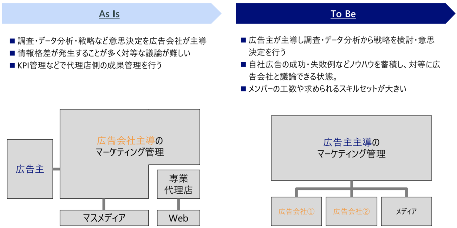 プロモーション領域においては、生活者が利用するメディアが多様化し、同時にテレビの広告メディアとしてのパワーダウンが起きている。そのため、これまでのように広告会社お任せのままでは難しい。今後は、広告主が主導しプロモーション業務を進行することが必要な時代となっている。