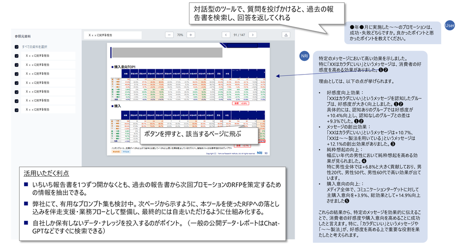 特に課題になりやすいのは、過去の分析レポートや調査データから得られた知見を施策に生かす業務だ。過去の分析レポートや調査データは多くの場合どこかのフォルダに格納されたままになっており、探すのが困難な状態であることが多い。以下の例ではAIを活用し、チャット形式で過去データを横断的に検索・chat形式での質疑応答を可能にしている。今後は、AIを活用したデータドリブン化の高度化が急務だ。