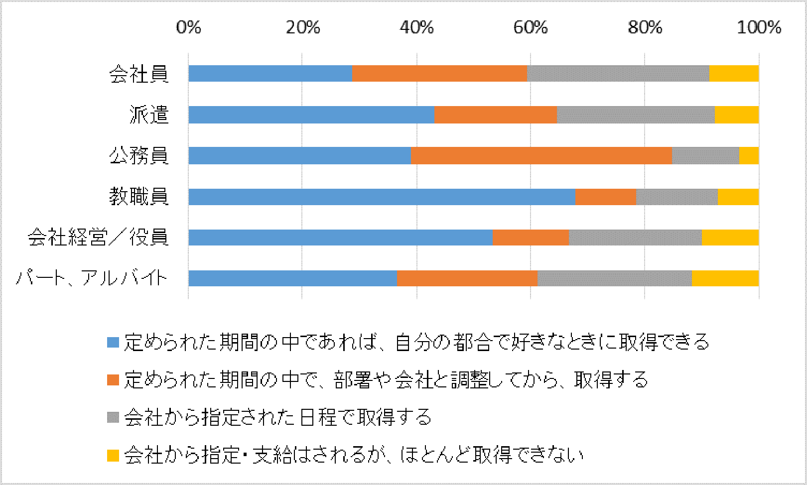 すると、やはり普通のサラリーマンの方々は、会社から指定される方が一番多く、自由に取れる、という意見は少数派のようです。また、面白いのは公務員の方々。部署と調整をしてから決める、というのが最も多く、自分勝手にとるというより、全員が一斉に居なくならないようバランスを見ながら決める、ということのようです。海外では、公務員も同じ時期に一気に休んでしまうのが当たり前の中、日本においては、公共サービスをいつでも同じように利用できるのは、この方々の"調整"の賜物かもしれませんね。