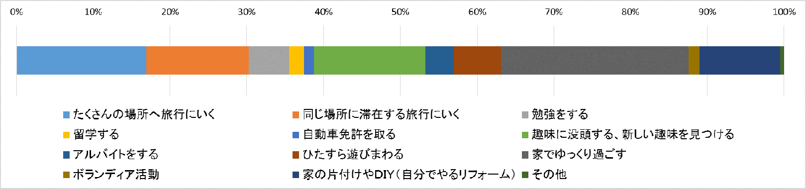 最も多かったのは、"家でゆっくり過ごす"。1ヶ月の長期のお休みであっても、自宅でゆっくり過ごしたい方が多いようです。日本人は皆、お疲れなのでしょうね。続いて多かったのは旅行。ヨーロッパの方によく見られる、滞在型の旅行というより、多くの場所にいくほうが多いというのも日本人の特徴なのでしょう。これら以外にも、趣味や片付け/DIYなどもかなりの方が挙げており、休みをいろいろなことに使いたい傾向があるようです。