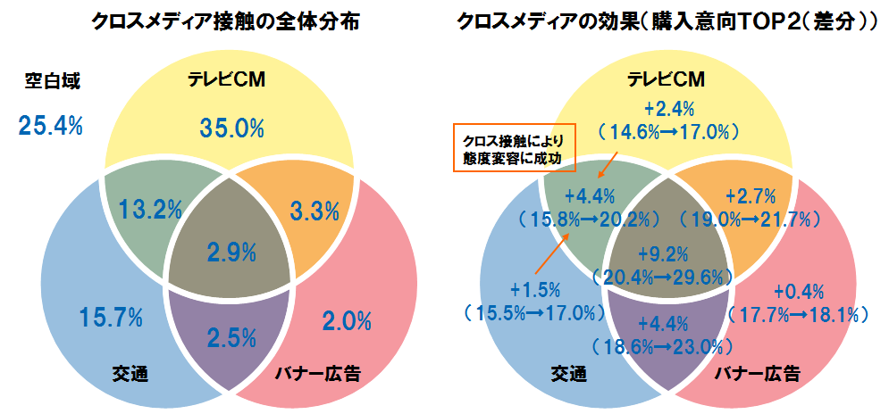 クロスメディア接触により目標変数が高まっているのか、それとも極力リーチを広げるために重なりは少なくなっているのか、など、目的どおりに各メディアが機能したのかを捉えることが可能です。