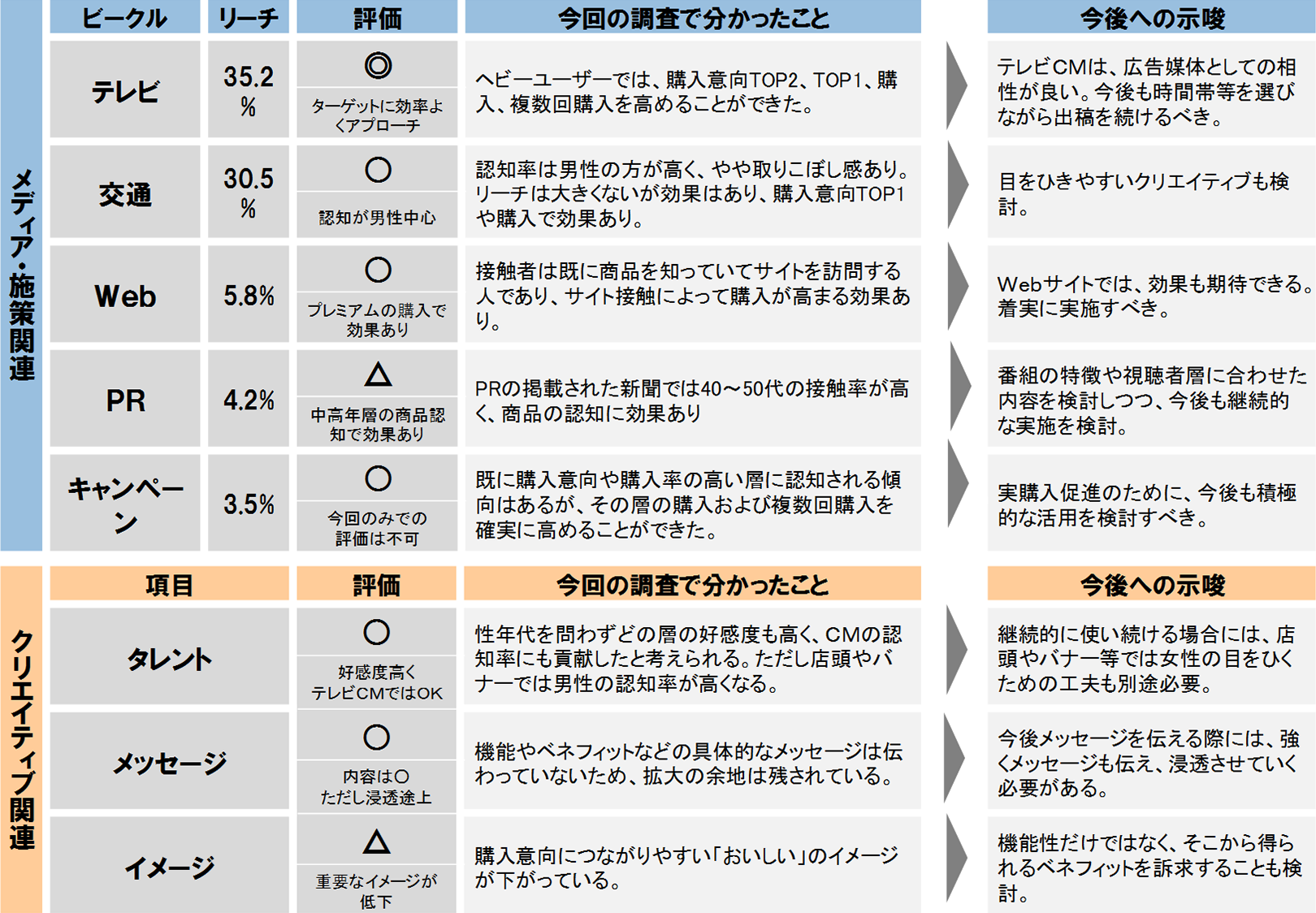 この事例では、味が変化したことだけではなく、「素材」や「製法」までが伝わることでと購入意向が高まることが分かります。そのため次のクリエイティブには、製法の訴求を強くするかどうかを検討することになるのです。