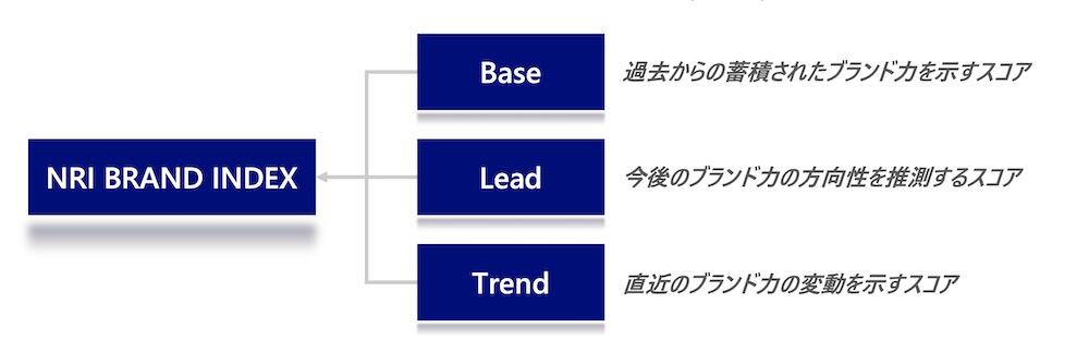 NRI BRAND INDEX®(NBI)は特定の商品・サービスごとに、過去から蓄積されたブランド力 を示す「Baseスコア」、今後のブランド力の方向性を推測する「Leadスコア」、直近のブランド力の変動を示す「Trendスコア」の3つの指標、およびそれらから合成する総合指標「NBI」で構成されています。これらを測定・算出することにより、当該商品・サービスについて、現在のブランド力だけでなく、ブランド力の将来性についても把握することができます。